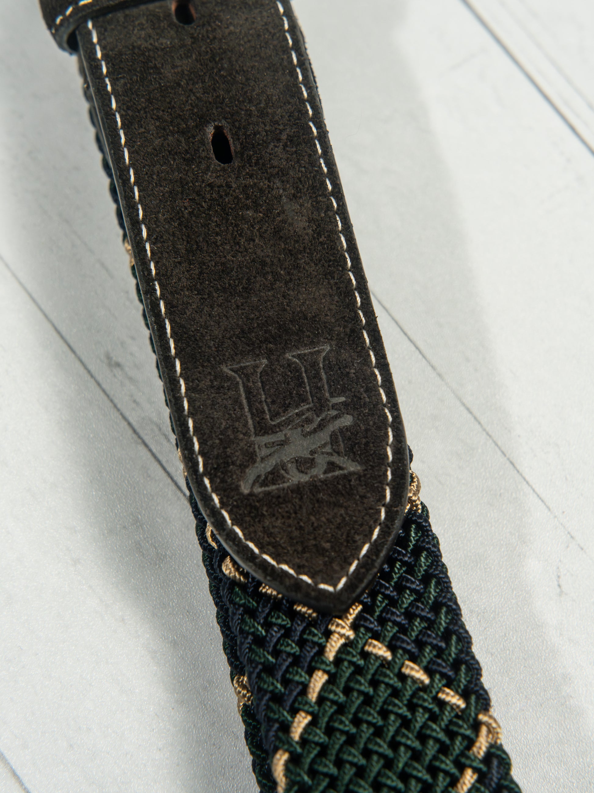 - Polished solid brass suede accented logo engraved buckle